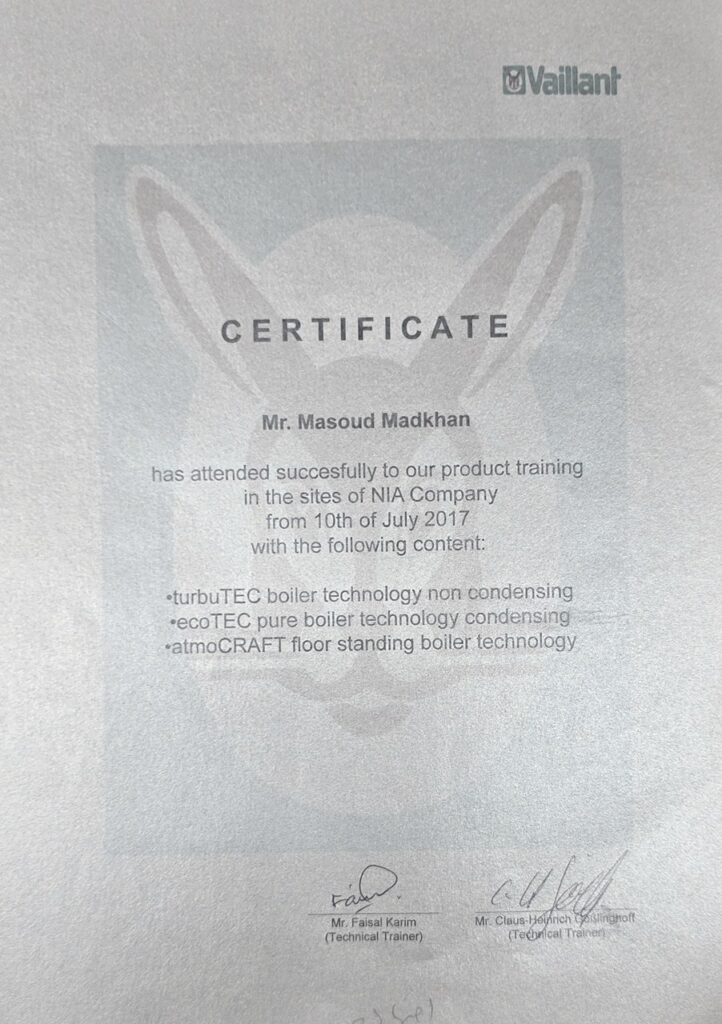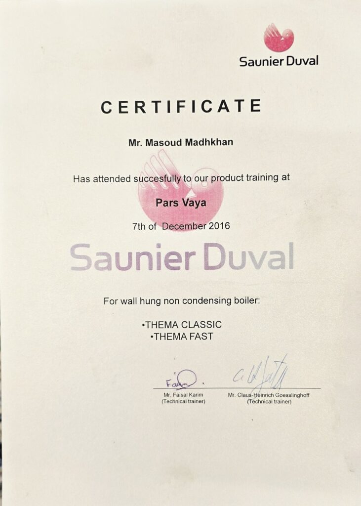 - دوره تخصصی شرکت Saunier Duval فرانسه (در همکاری با نمایندگی Pars Vaya در سال ۲۰۱۶)