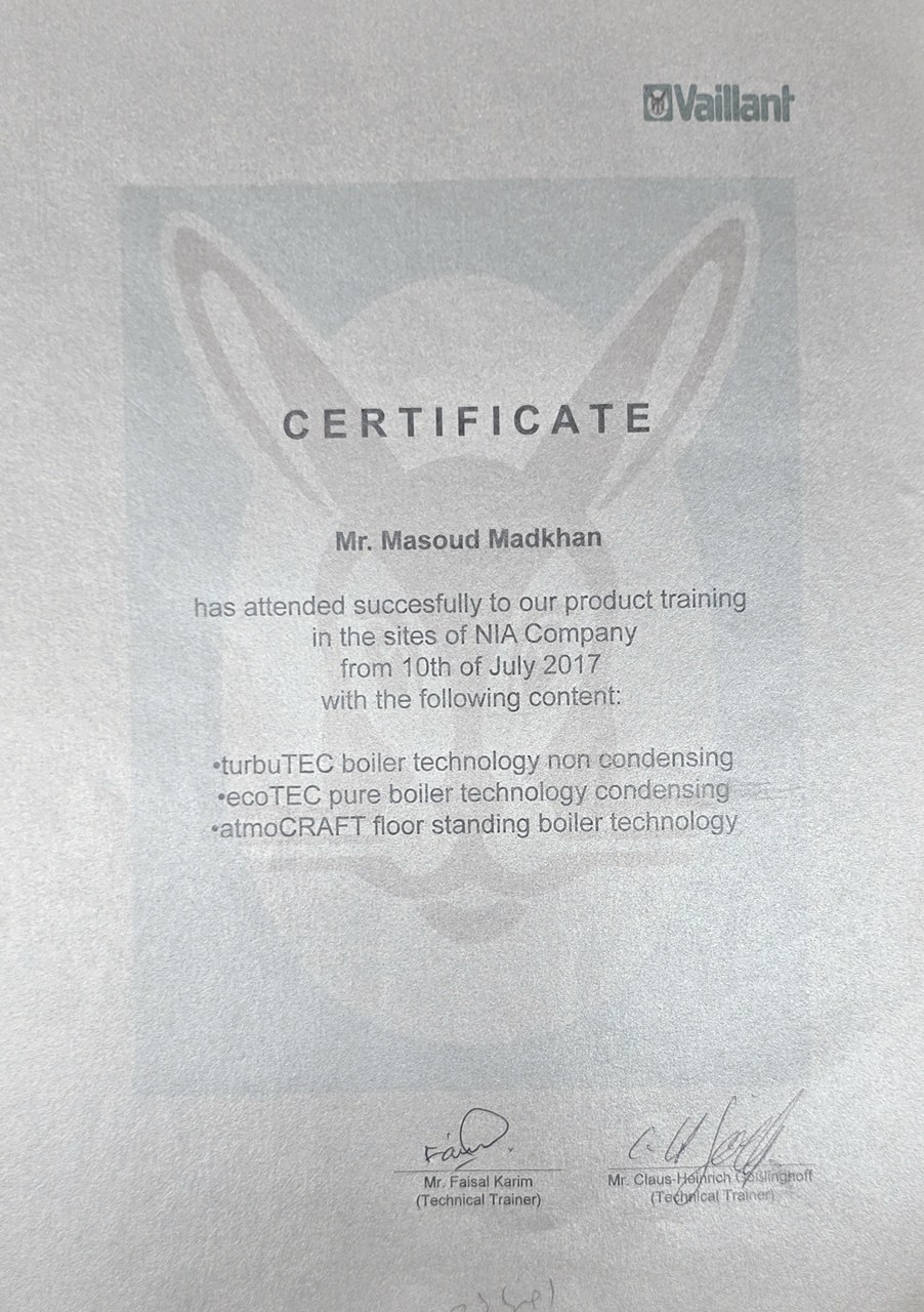 من مسعود مدح خان، متخصص تأسیسات گرمایشی در اصفهان با مدارک بینالمللی از برندهای معتبر اروپایی، با بیش از سه دهه فعالیت تخصصی در زمینه نصب، راهاندازی و عیبیابی پکیجهای دیواری و سیستمهای گرمایشی در اصفهان، آمادهام تا خدماتی حرفهای، اصولی و مطابق با استانداردهای بینالمللی به شما ارائه دهم.