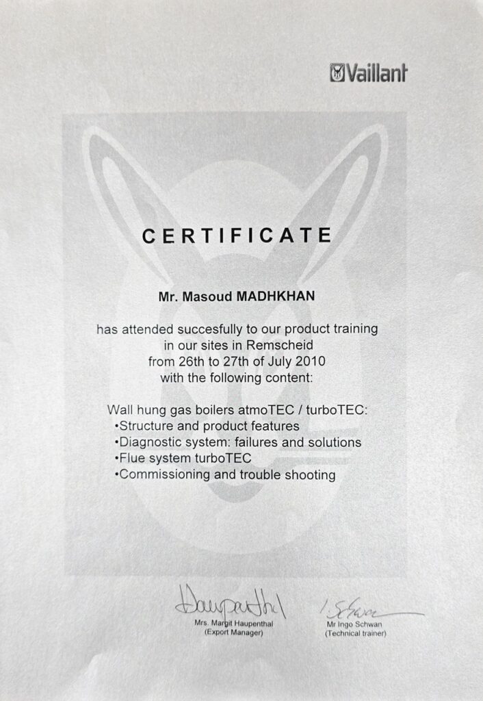 - دوره تخصصی شرکت Vaillant آلمان (در شهر رم در ۲۰۱۰)